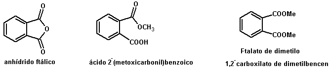 Te muestro una imagen con los nombres de las sustancias involucradas en la reacción de metanólisis del anhídrido ftálico, con un eq. y con 2 eq. del metanol: