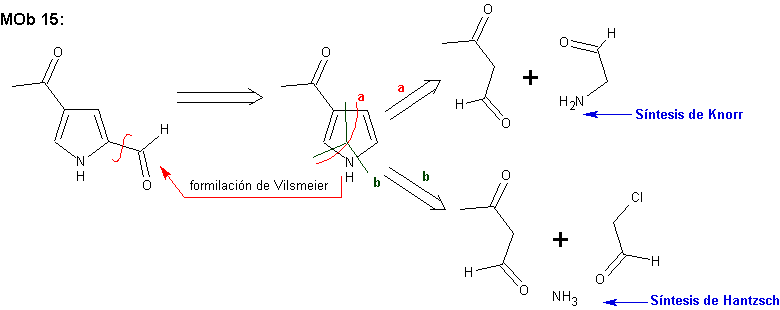 La alternativa B propuesta para la síntesis de la MOb 08 es incorrecta, en cambio la alternativa A, puede ser viable, si previamente se modifica, las reacciones de bromación del pirrol (El NBS es un reactivo que se utiliza para las bromaciones por radicales y lo que se require es una halogenación del pirrol por SEA) ssería preferible una cloración del pirrol, pues por ser muy reactivo a la SEA, la bromación corriente termina en una multibromación.