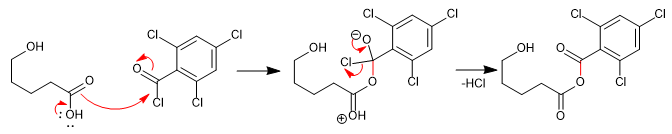 La formation d'une lactone part du traitement de l'hydroxyacide par le chlorure de 2,4,6-trichlorobenzoyle en présence de triéthylamine, nécessaire pour neutraliser l'acide chlorhydrique libéré à ce stade. L'anhydride mixte produit est traité avec du DMAP dans du toluène, dans des conditions de dilution élevée, donnant la lactone souhaitée.